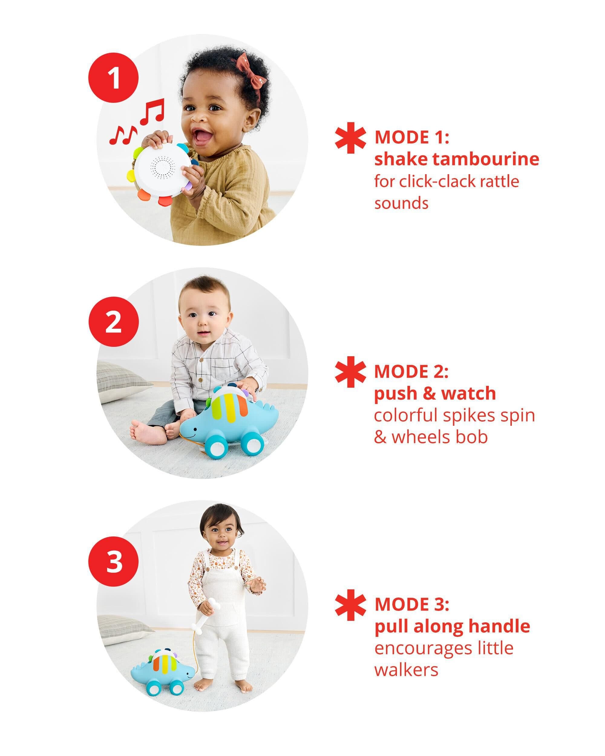 Una pandereta extraíble facilita que las pequeñas manitas la agiten solas. También puedes colocar la pandereta sobre el lomo del dinosaurio, empujarlo y ver cómo giran las púas mientras las ruedas se balancean. En el modo tres, un asa de «hueso» integrada anima a los pequeños caminantes a llevar a su divertido amigo dinosaurio a pasear.